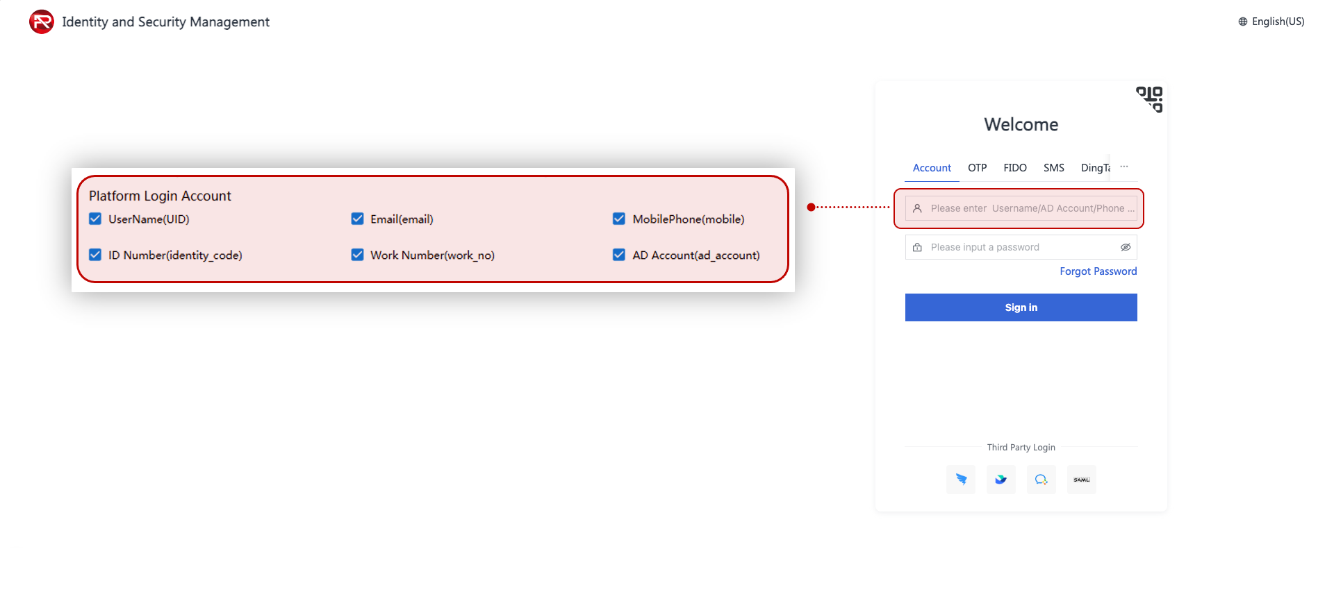 Defines the supported account formats for username+password login (or any method requiring username input such as OTP, FIDO). The configured hint will appear in the login input field.